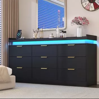 9 Drawer Dresser with Charging Station LED Light Organizer Cabinet